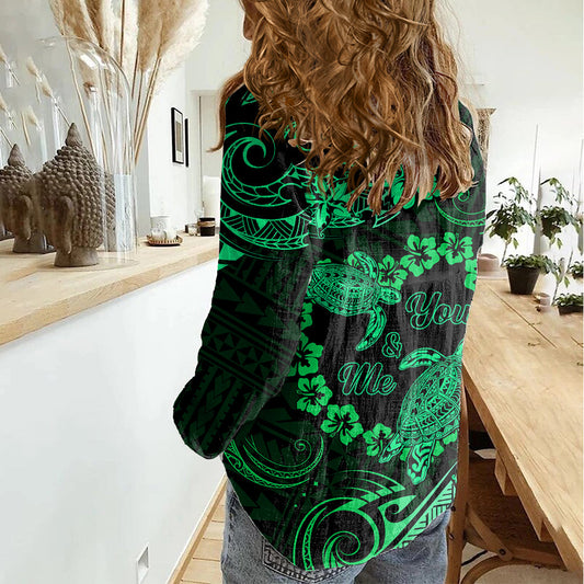 Polynesian Turtle Valentine Damen Casual Shirt You And Me Grün Hibiskus Herz LT01