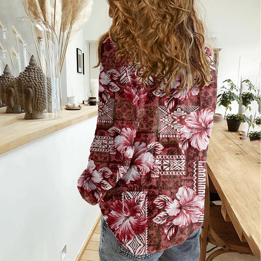 Hawaiianisches Quiltmuster Damen Freizeithemd Hibiskus und Tribal-Element Vintage Red Vibe LT03