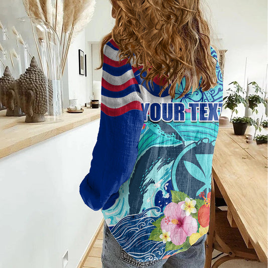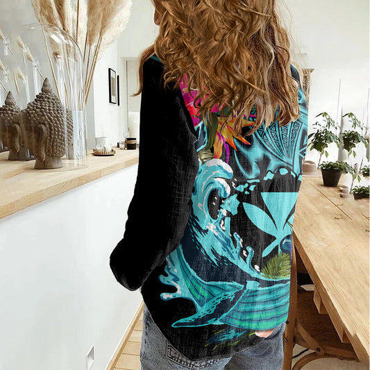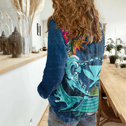 Hawaii Damen Freizeithemd Wal Mix Hibiscus und Kanaka Maoli Blau Version LT03