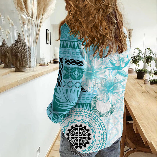 Samoa Siapo-Muster mit blaugrünem Hibiskus Damen Freizeithemd LT05