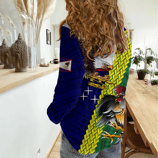 Personalisiertes Amerikanisch-Samoa und Vereinigte Staaten Damen Casual Shirt Weißkopfseeadler und Robbe Hibiskus Polynesisches Muster LT03