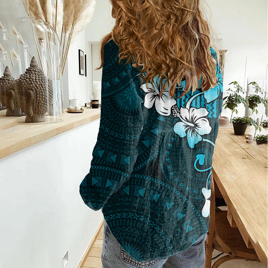 Fiji Masi Paisley Damen Freizeithemd Fijian Hibiscus Tapa Türkis Version LT01