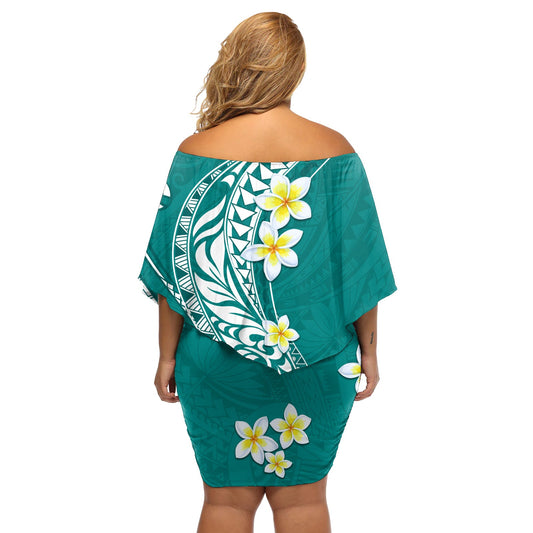 Hawaii Aloha Schulterfreies Kurzes Kleid blumen Plumeria Vintage - Teal LT7