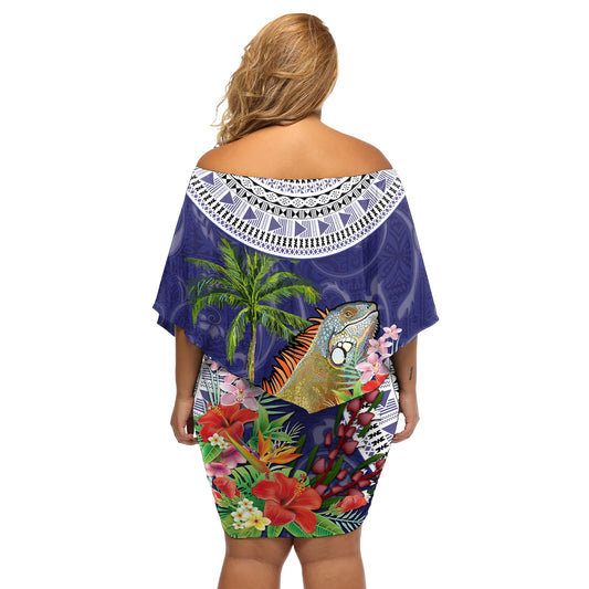 Bula Fiji Crested Iguana Schulterfreies kurzes Kleid blumen Tagimaucia Tapa Tribal Blau Farbe LT03
