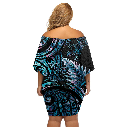 Neuseeland Eidechse Off Shoulder Kurzes Kleid blumen Silber Farn Aotearoa Maori mit Paua Muschel LT14