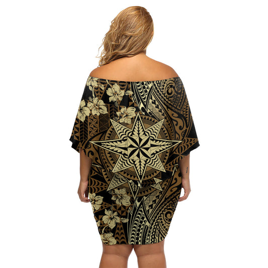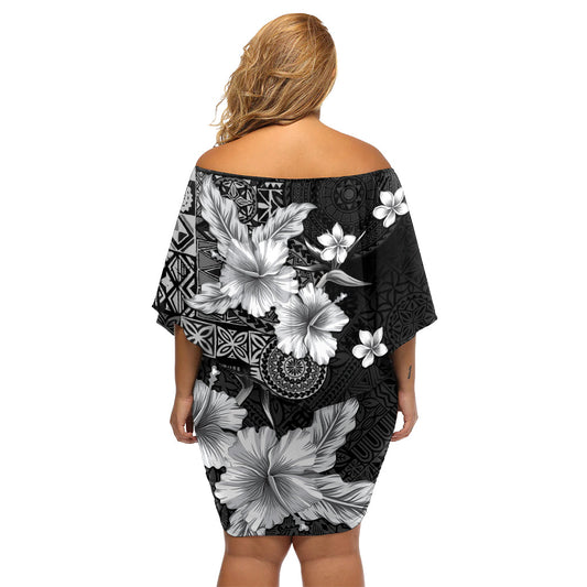 Hawaii Tapa Muster mit schwarzem Hibiskus Off Shoulder Kurzes Kleid Blumen LT05
