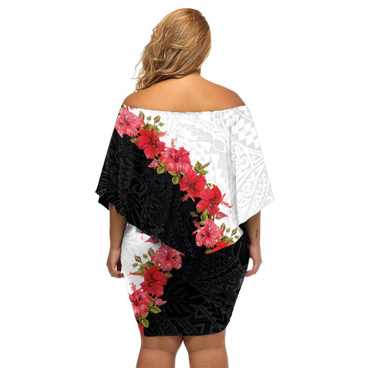Hawaii Graustufen Hibiskus Blumen Off Schulter Kurzes Kleid Blumen Polynesian Muster Mit Halb Schwarz Weiß Version LT03