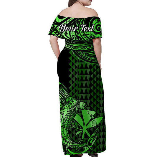 Hawaii Hammerhai Schulterfreies Langes Kleid Polynesischer Kakau Mit Kanaka Grün LT14