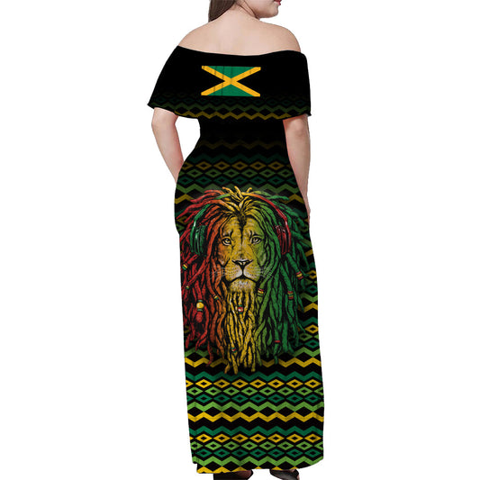 Jamaika schulterfreies langes Kleid Einzigartiger Rastafari-Löwe - Flag Vibes LT8