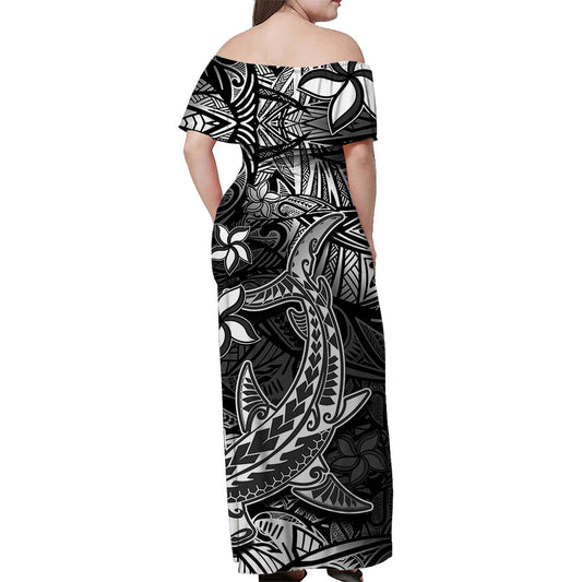 Polynesisches schulterfreies langes Kleid Schwarz Hawaiianischer Stammes-Hammerhai LT14
