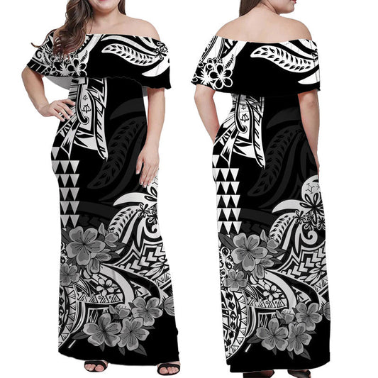 Hawaii Kakau Off Shoulder Langes Kleid Polynesian Floral Tribal Schwarze Version LT9