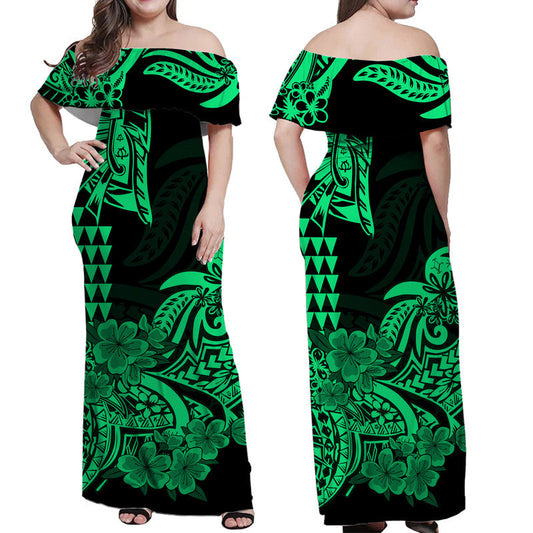 Hawaii Kakau Off Shoulder Langes Kleid Polynesian Floral Tribal Grün Version LT9