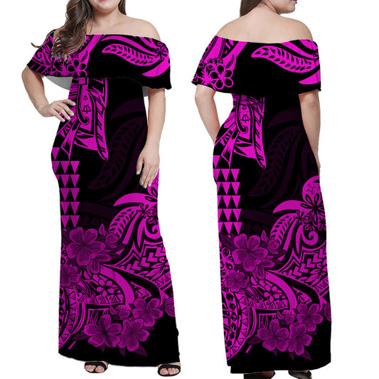 Hawaii Kakau Off Shoulder Langes Kleid Polynesian Floral Tribal Pink Version LT9