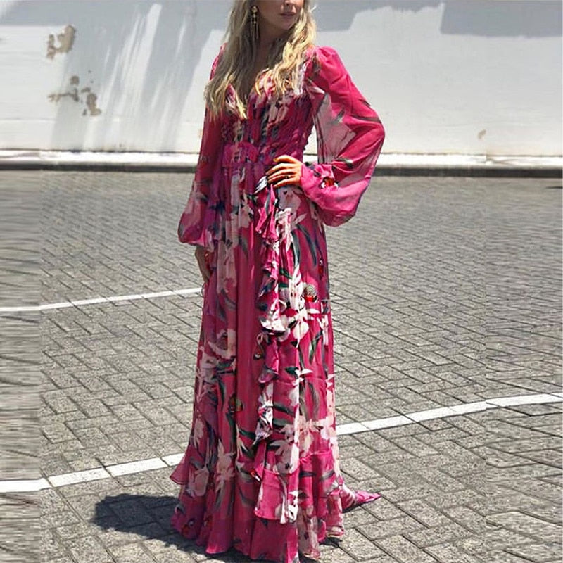 Ein langes Blumenkleid im Boho-Stil, um Ihren Boho-Chic-Stil zu unterstreichen.