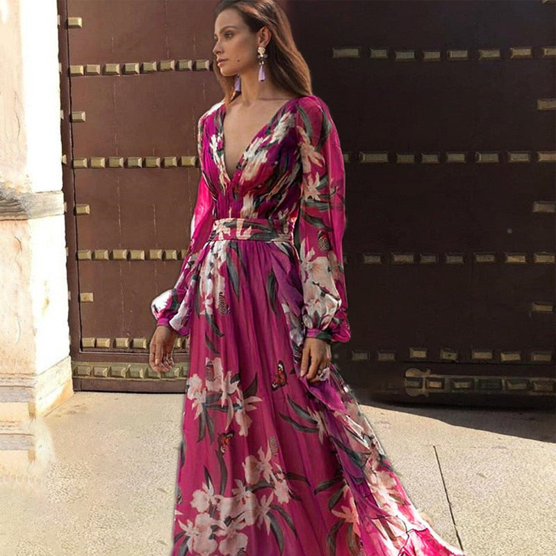 Der böhmische Stil ist sehr gefragt und im Trend Mit diesem langen Herbst-Winter-Blumenkleid tauchen Sie direkt ein!