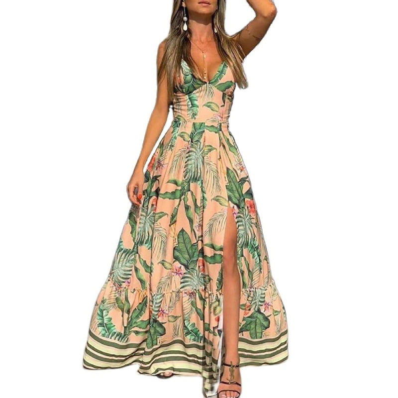 Mit dem geschlitzten Petticoat für einen sexy Effekt und gute Bewegungsfreiheit ist dieser tropische Blumen- und Blattdruck perfekt, um an die Savanne zu erinnern und seine Beige-Gelb-Töne.