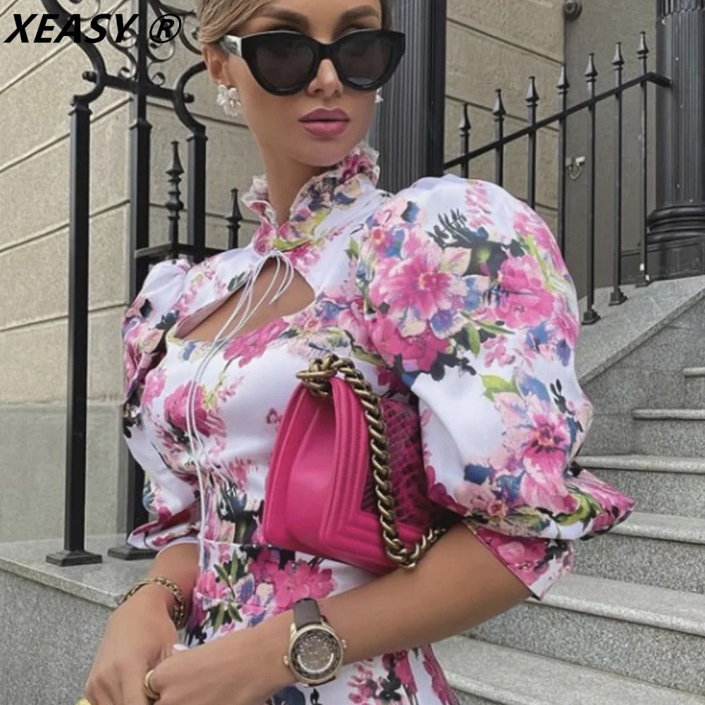 Entdecken Sie einen erstaunlichen Stil, sowohl Vintage als auch modern, mit diesem Blumenkleid mit Ballonärmeln. Ein Rundhalsausschnitt mit einem dünnen Band, das eine Öffnung am Ausschnitt verdeckt: originell und sehr trendig.
