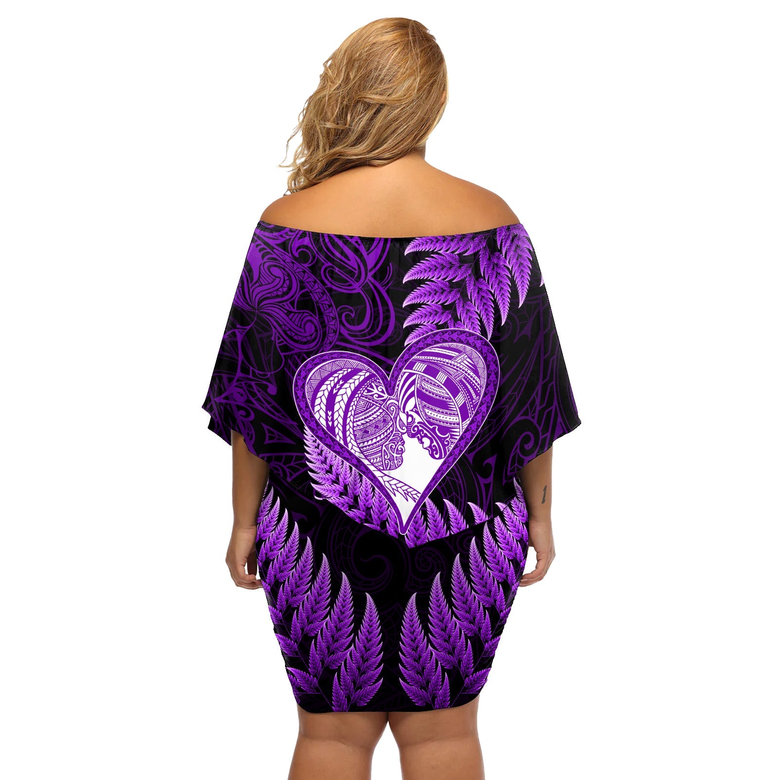 Neuseeländisches schulterfreies kurzes Kleid blumen zum Valentinstag, Aotearoa Warrior Love Story, Silver Fern Koru, Purple Style